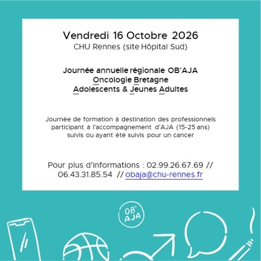 En 2026, cette journée de formation, à destination des professionnels de santé bretons participant à l’accompagnement d’Adolescents et de Jeunes Adultes suivis pour un cancer, aura lieu à CHU Rennes (site Hôpital Sud), le Vendredi 16 Octobre.